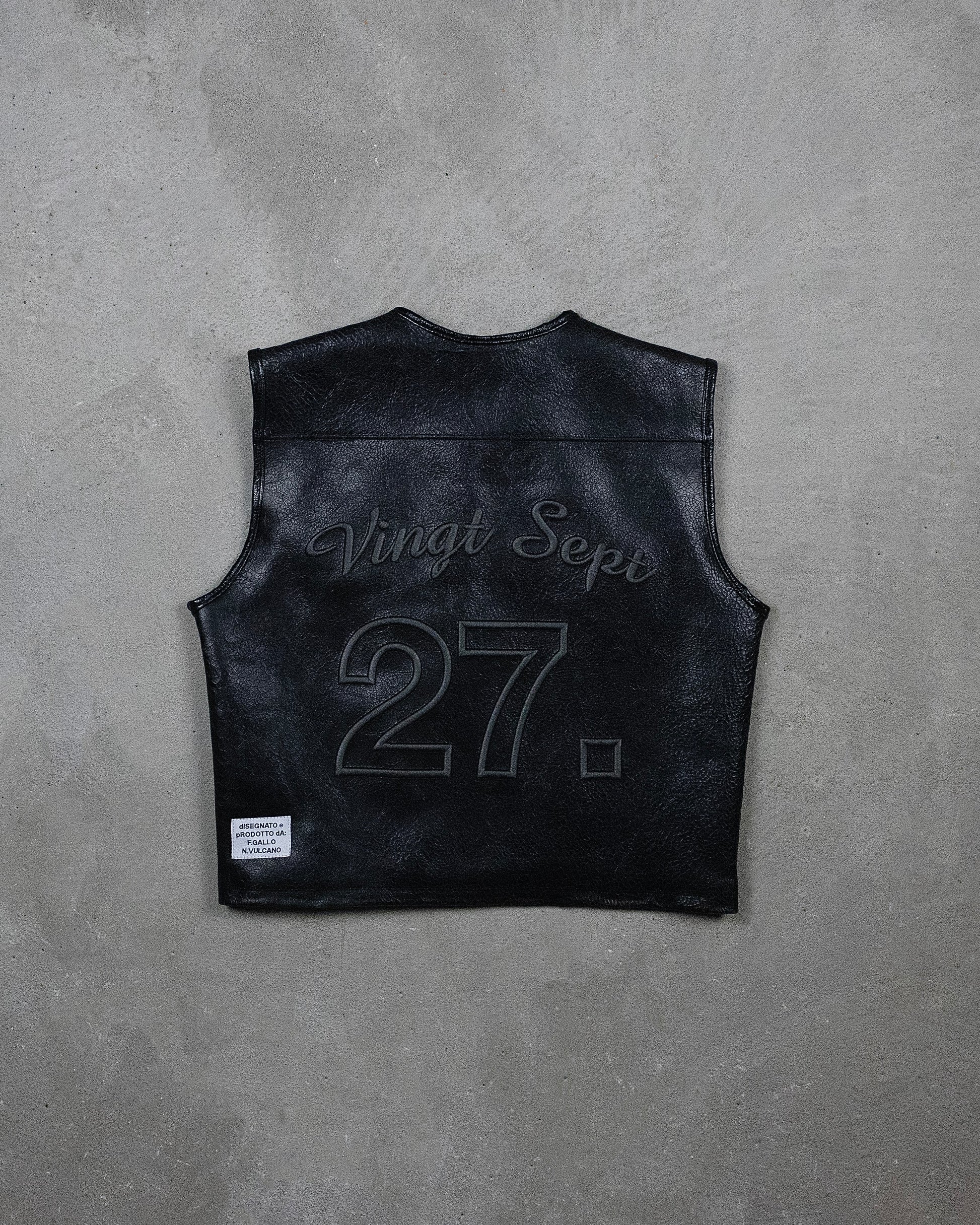 Questo gilet in pelle è interamente realizzato in pelle di vitello nero. Sul davanti chiusura zip e tasche, logo ricamato lato cuore. Sul retro ricamo "Vingt Sept" e 27. Grigio -100% pelle di vitello