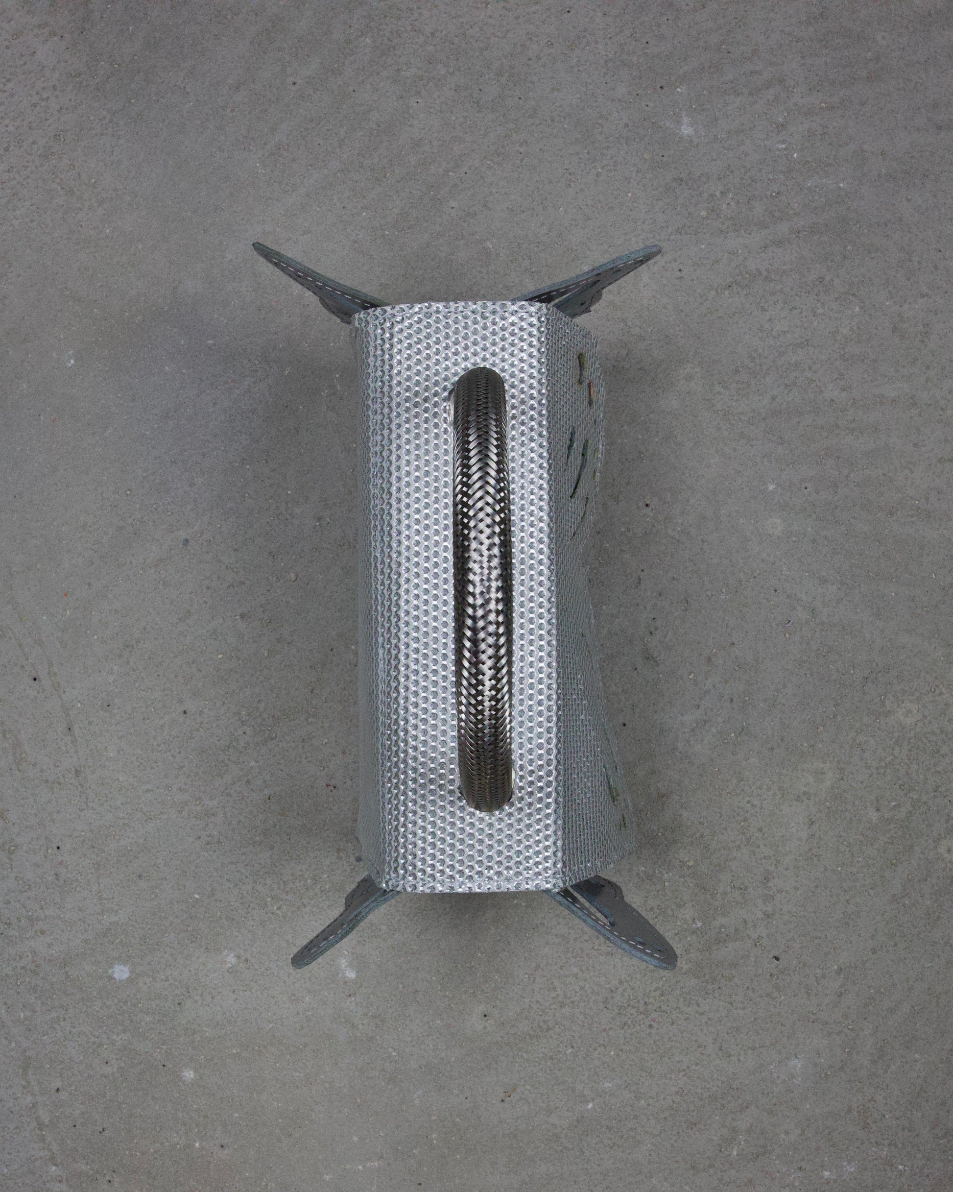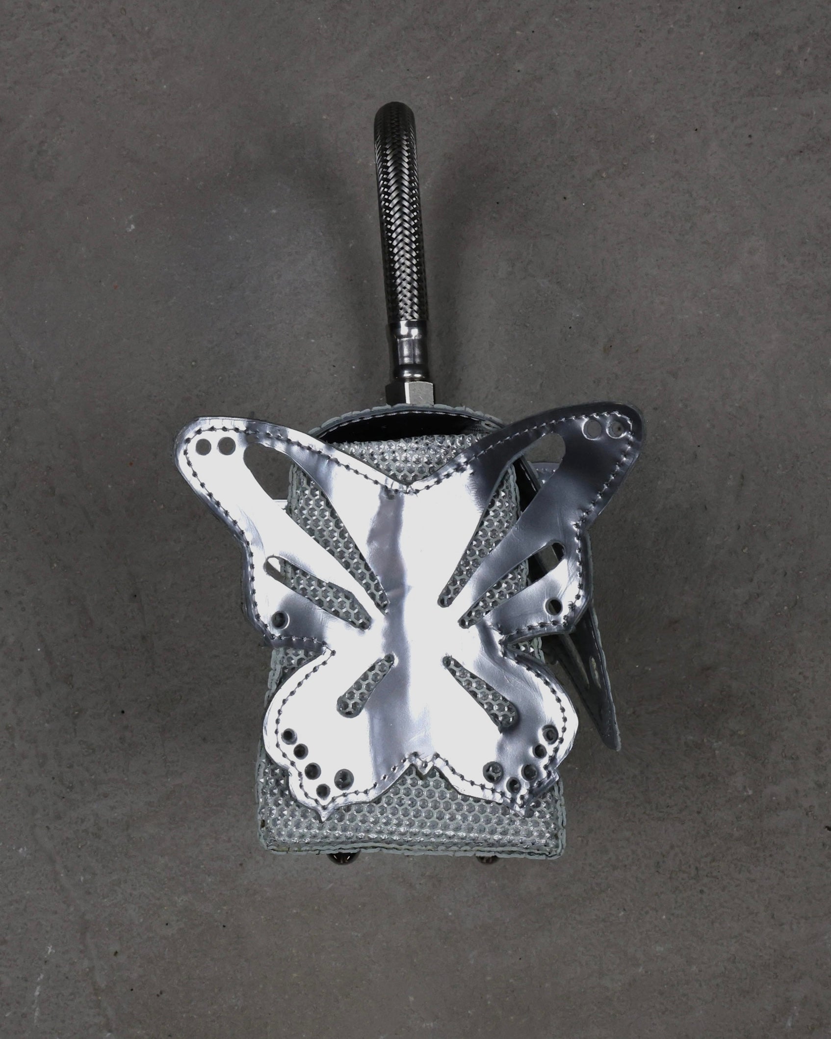 Borsa, di dimensione piccola, realizzata con pelle di vitello traforata e , sul lato farfalla incavata realizzata con pelle di vitello argento specchiato. Il manico in acciaio .