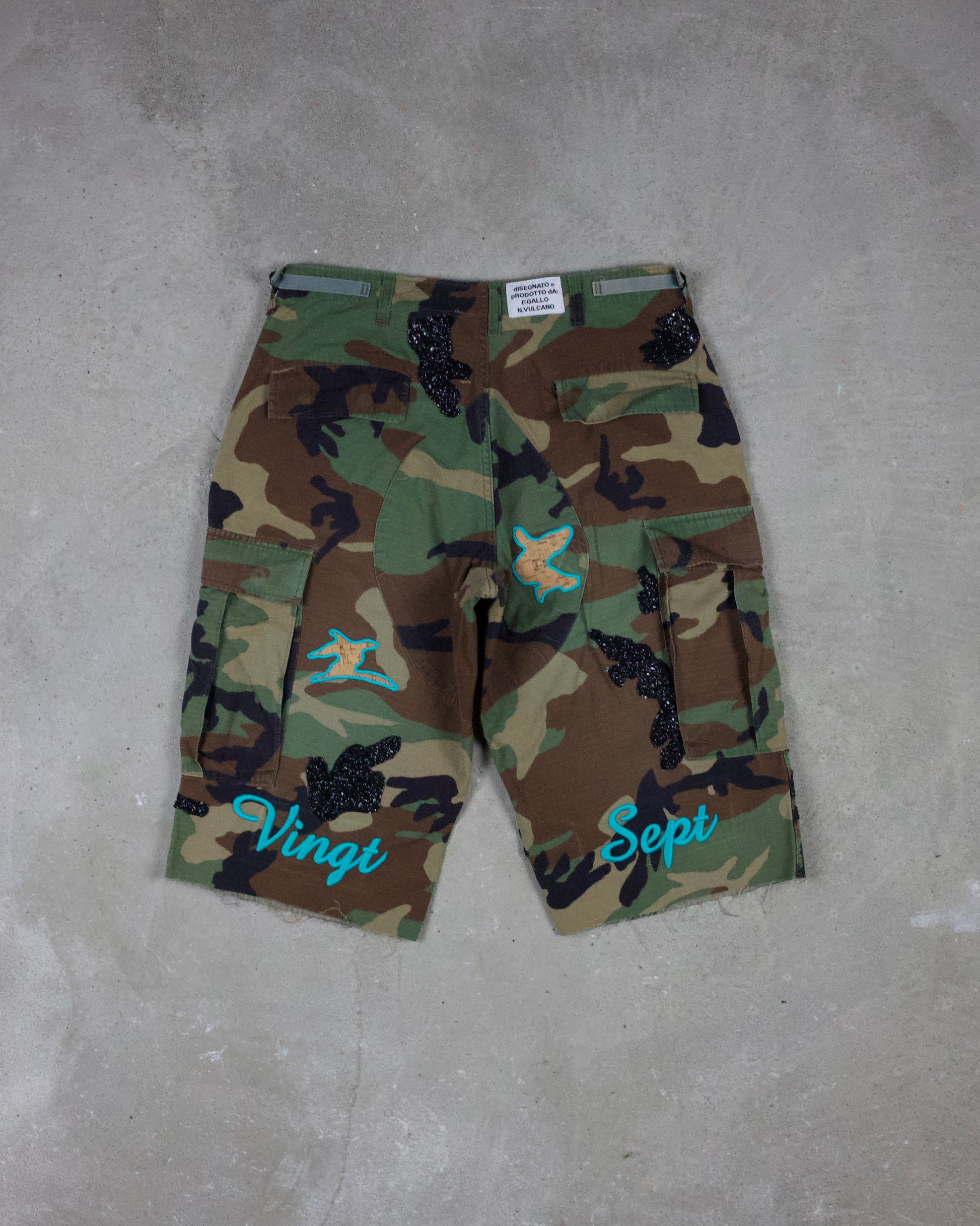 Pantaloncini camo con applicazioni e ricami. Sul retro ricamo "Vingt Sept"