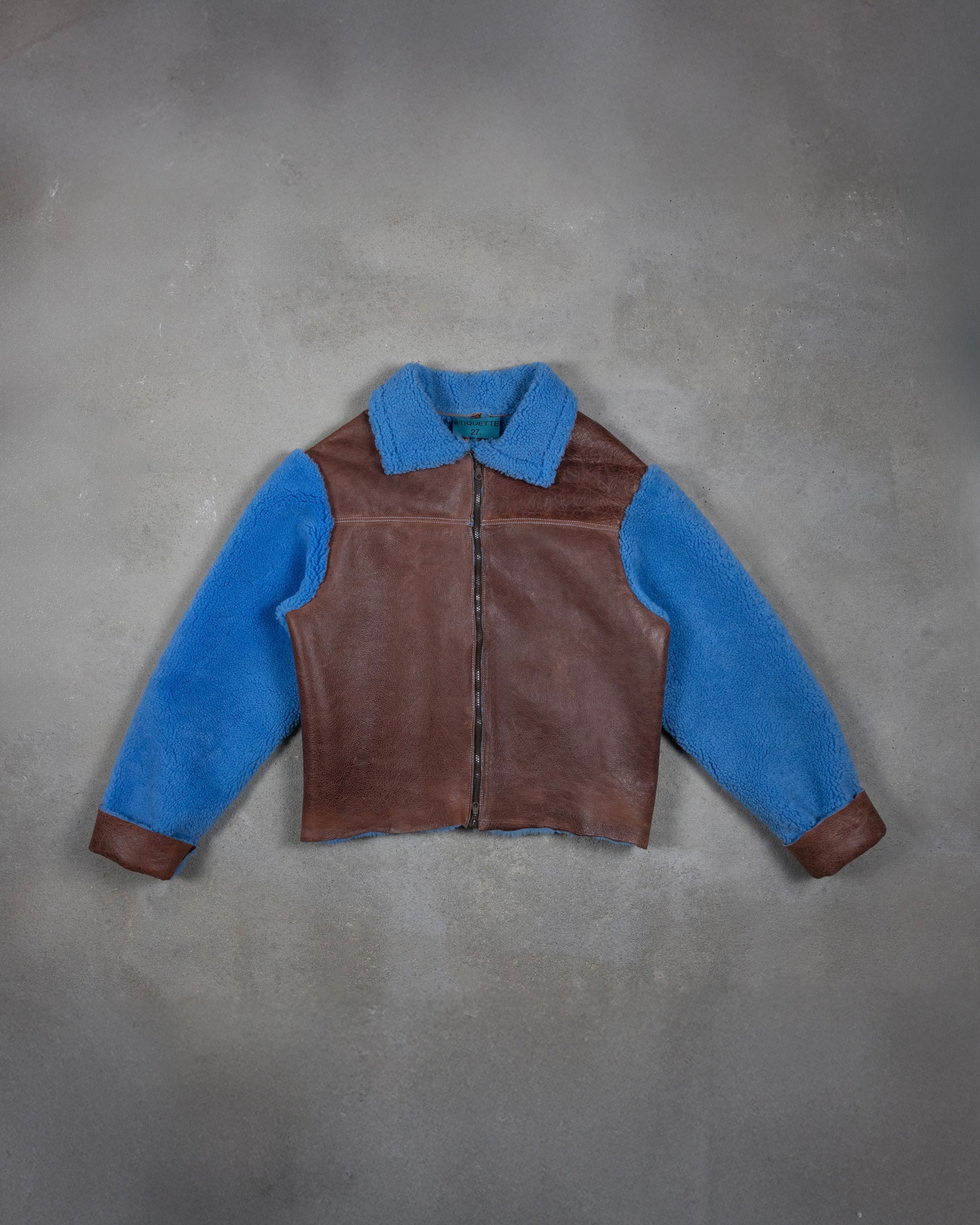 Questa giacca unisex è realizzata in shearling semi-riccio e rifinita con inserti in pelle pieno fiore. Il modello presenta una grafica sul retro realizzata a mano consumando la pelle. Impunture azzurre, maniche interamente in shearling, colletto con risvolti in pelliccia , chiusura frontale con zip.