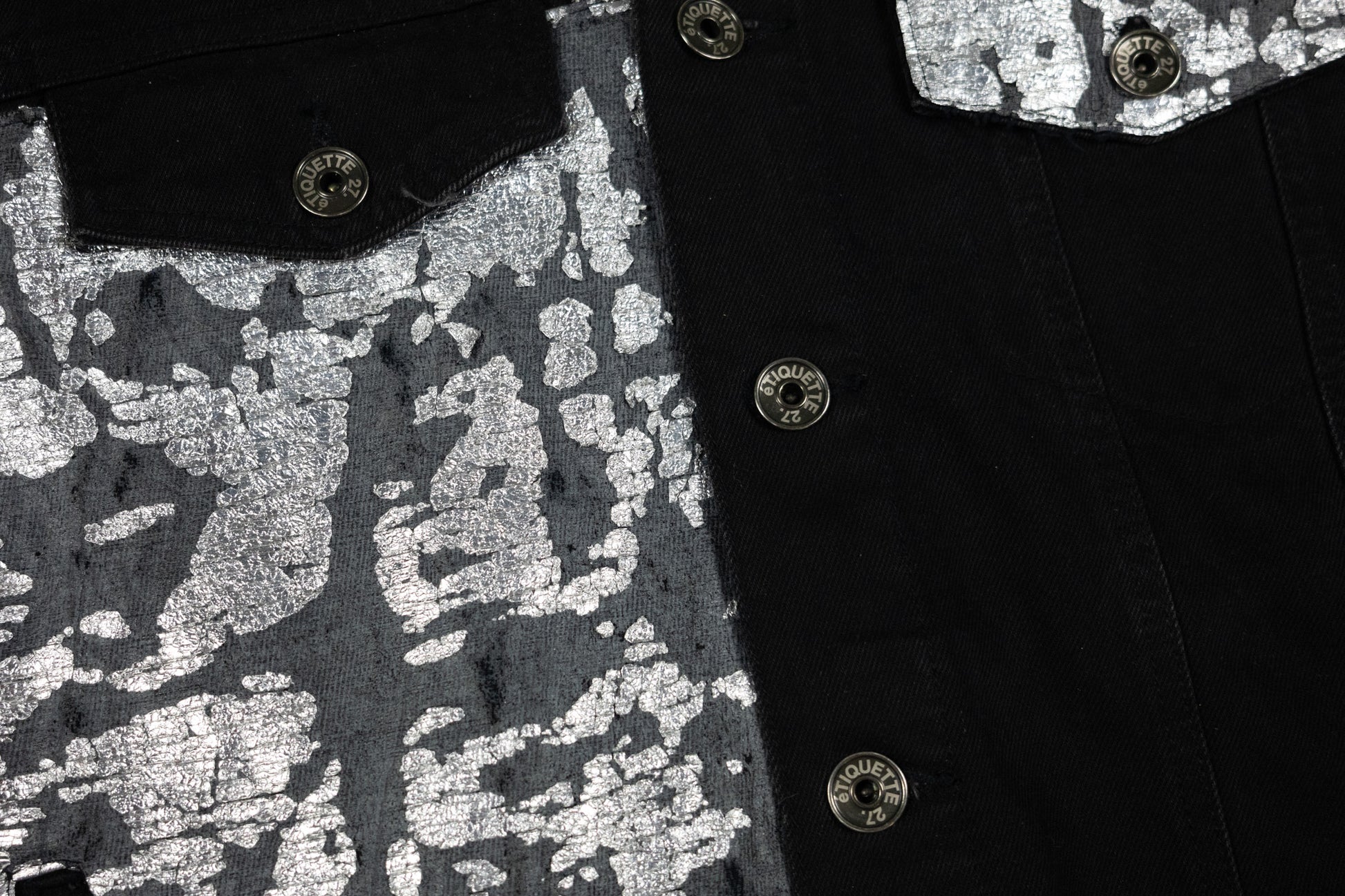 Denim Jacket con applicazioni argento. Sul petto davanti intarsi con 27. Sul retro logo con applicazioni tessuto argento.
